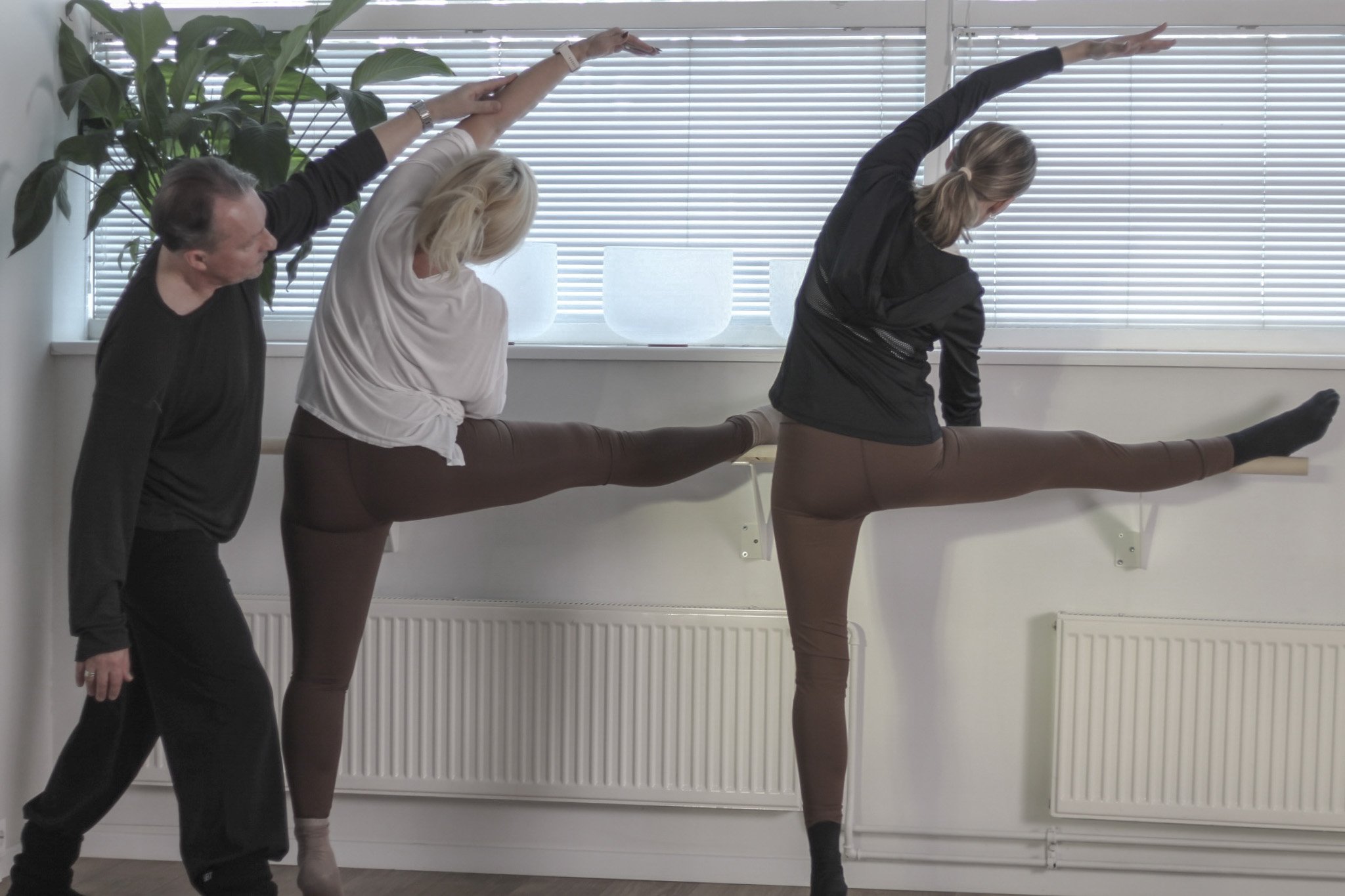 Harjoituksessa käytetään balettitankoa tasapainon tukena sekä tarvittaessa pienvälineitä kuten kuminauhoja ja kevyitä painoja.
